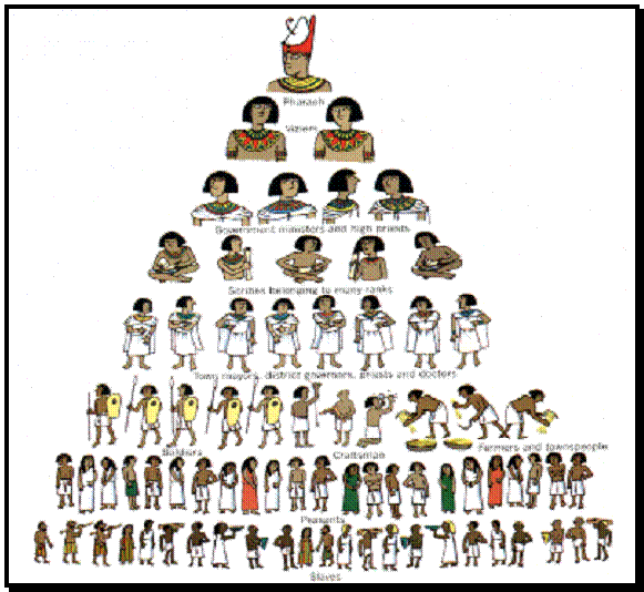 Beneath them are the soldiers, artisans and farmers, and at the bottom, the serfs or peasants. Lowest of all were the slaves. To learn more about the government in Ancient Egypt, click here. This site might be helpful as well.